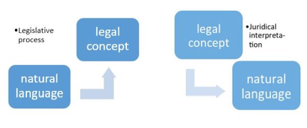 With another process, interpretation of a law, one sees a counter-process that entails the operation of transforming the legal concept back into the concept from natural language. This can be presented graphically as follows: *29